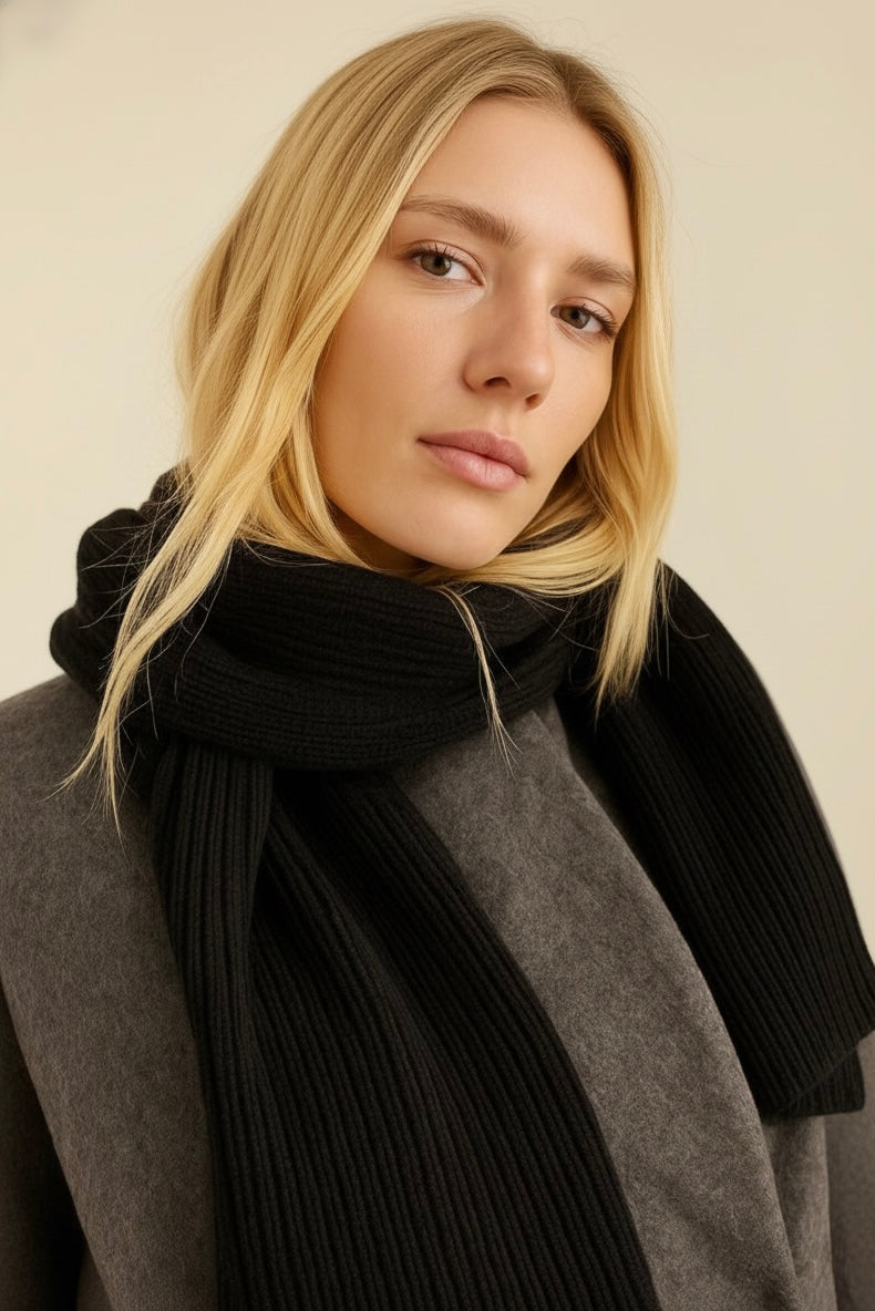 Textura tricotată este densă, elastică și stabilă, astfel încât fularul își păstrează forma în timp — fără să se întindă, fără să se răsucească și fără să se scămoșeze ușor. Este suficient de lung pentru a fi purtat lejer sau înfășurat în jurul gâtului, adaptându-se ușor diferitelor stiluri și nevoi.
